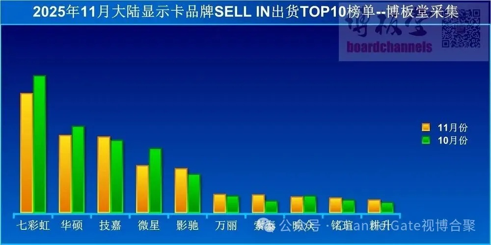 今天博板堂整理出各个显卡品牌厂商2025年11月在中国大陆地区的出货数据,显示相比10月环比下降了4%左右,相比2024年11月同比增长了17%左右。在11月份里,各品牌显卡厂商出货表现呈现了环比小幅下降的趋势,RTX 50系列供应相对充足,不过销售情况不太给力,线上销售也不太理想。考虑到未来显存涨价,经销商存在一定备货现象。